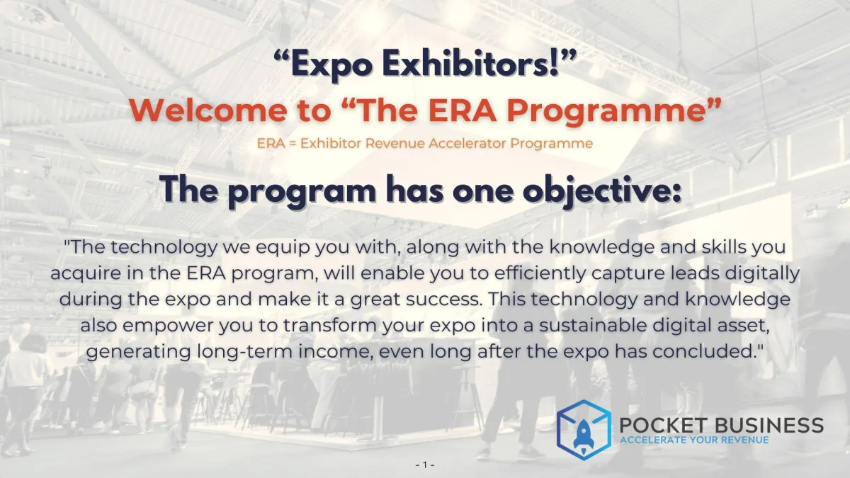 1. Maximise Exhibition Success: The ERA Programme provides you with the knowledge and tools to significantly increase your exhibition success. Whether you're an experienced exhibitor or new to the game, the programme offers strategies for increasing leads, conversions, and revenue from your exhibitions.
